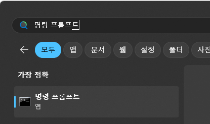 1. 키보드 윈도우버튼 혹은 왼쪽하단의 윈도우 아이콘을 누르고 "명령 프롬프트" 를 입력 후, 실행합니다.