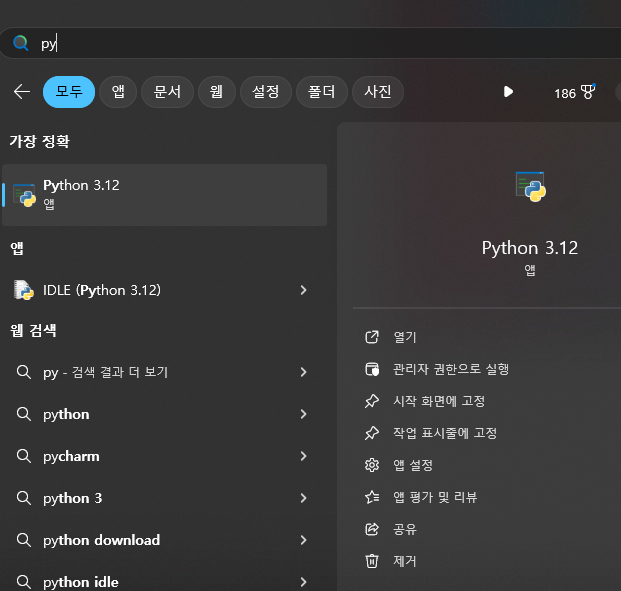 간혹 "python"명령어가 인식되지 않는 경우가 있을 수 있습니다. 이때는 Windows 설정에서 앱 실행 별칭을 확인하거나, 시스템 환경 변수를 점검해볼 필요가 있습니다. 대부분의 경우 Windows를 재시작하면 해결됩니다.